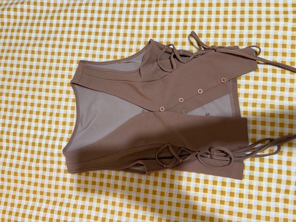 Kahverengi bluz normal midi boyda ve vücuda oturan kesime sahiptir. Düz yüzeyli, yanlarda bağcık detayları ve ön kısımda ayarlanabilir düğmeler bulunur.