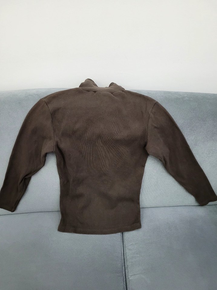 kahverengi ve boğazlı uzun kollu, vücuda oturan kadın kazak. Normal midi boyunda, günlük dış mekan kullanımı için uygundur.