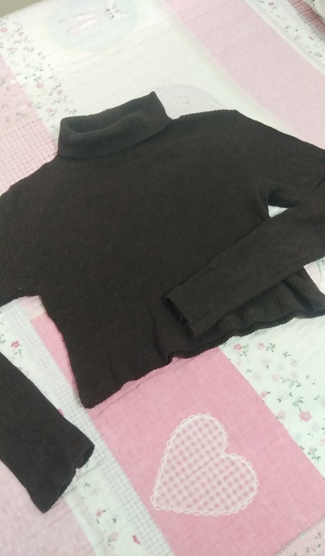 Kahverengi, boğazlı, uzun kollu, vücuda oturan örme kazak, sade ve rahat gotik tarzı sunuyor. Kroptur boyu 34 cm dir