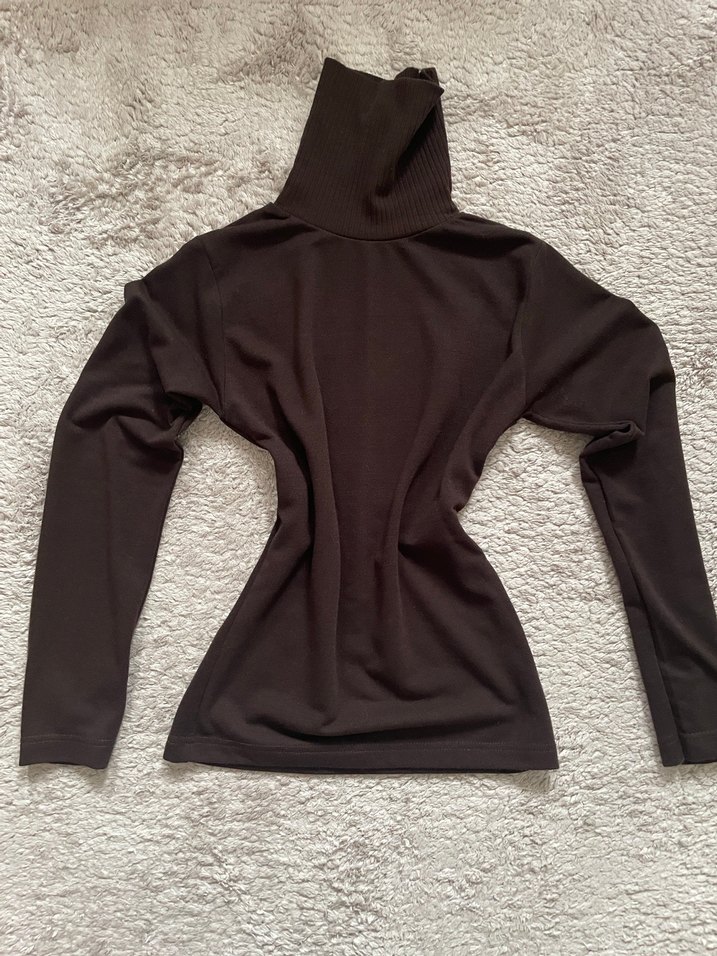Kahverengi, boğazlı ve uzun kollu, vücuda oturan kadın kazak. Normal boyda, yumuşak dokulu, günlük kullanım için uygun, sokak stiliyle uyumlu.