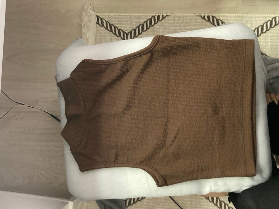 Kahverengi boğazlı, kolsuz ve vücuda oturan kadın süveter, rahat ve sade bir stil sunar.