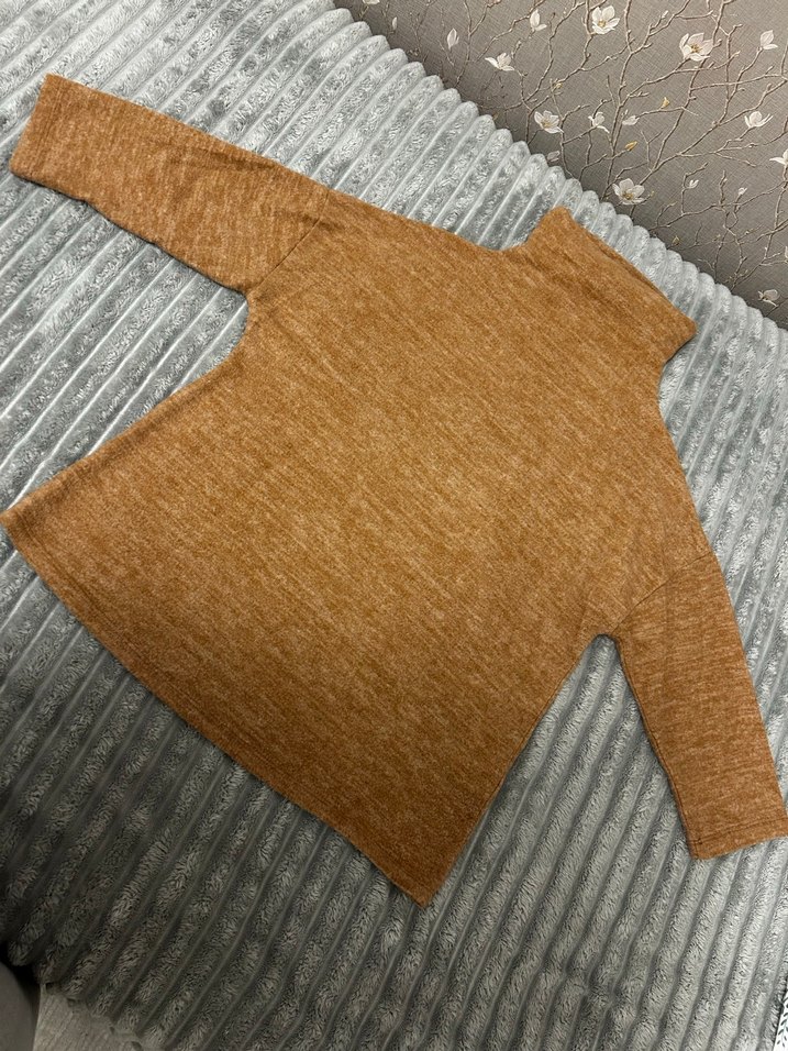 Kahverengi boğazlı, uzun kollu, örme kadın kazak. Rahat kesimi ve normal uzunluğu ile günlük kullanıma uygun, modern ve konforlu bir parça.