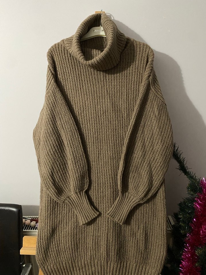 S/M beden uyumlu Kahverengi örgü kumaştan, boğazlı ve uzun kollu, rahat kesimli gündelik kullanıma uygun kadın kazak.