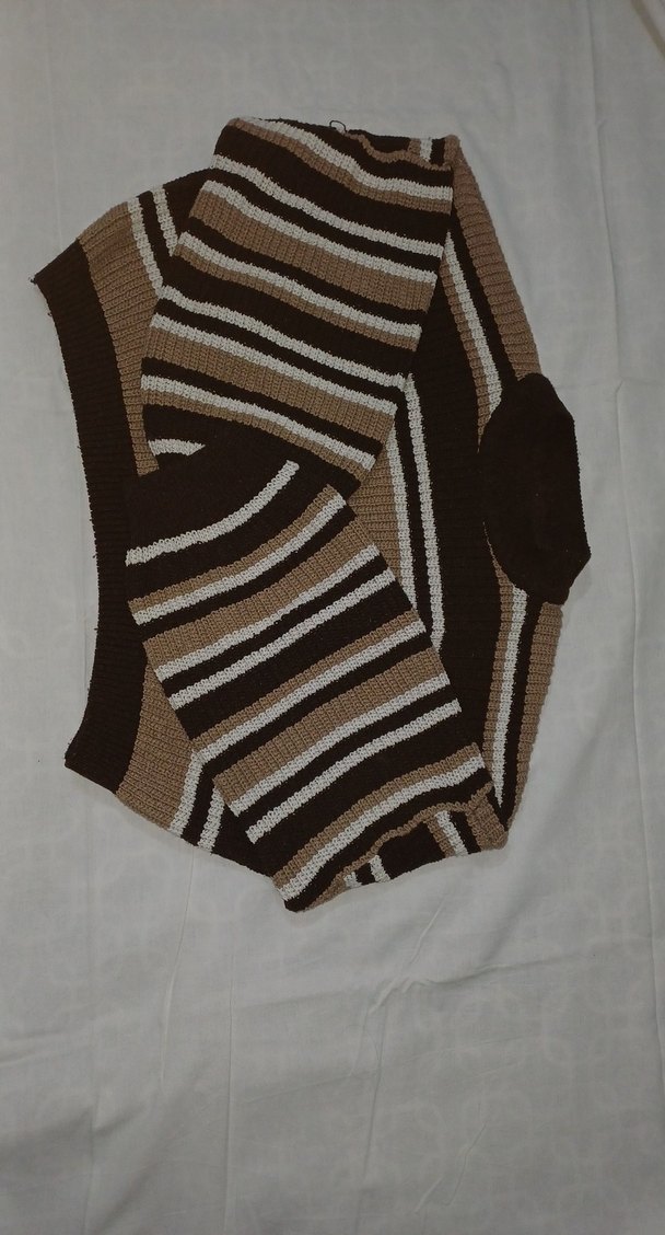 Salaş kesim, uzun kollu ve boğazlı örgü kadın kazak, yumuşak kahverengi kumaş ve çizgili desenlerle.