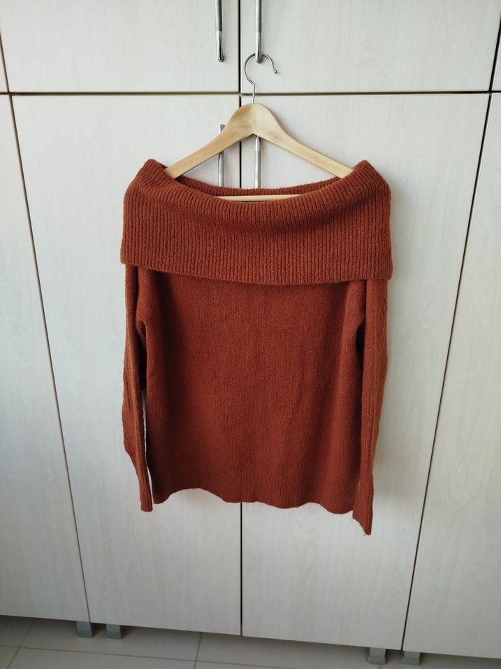 Kahverengi örgü yün kazak, boğazlı yakası ve uzun kollu, bol kesimiyle günlük rahatlık ve bohem tarz sunar. defosuz tertemizdir