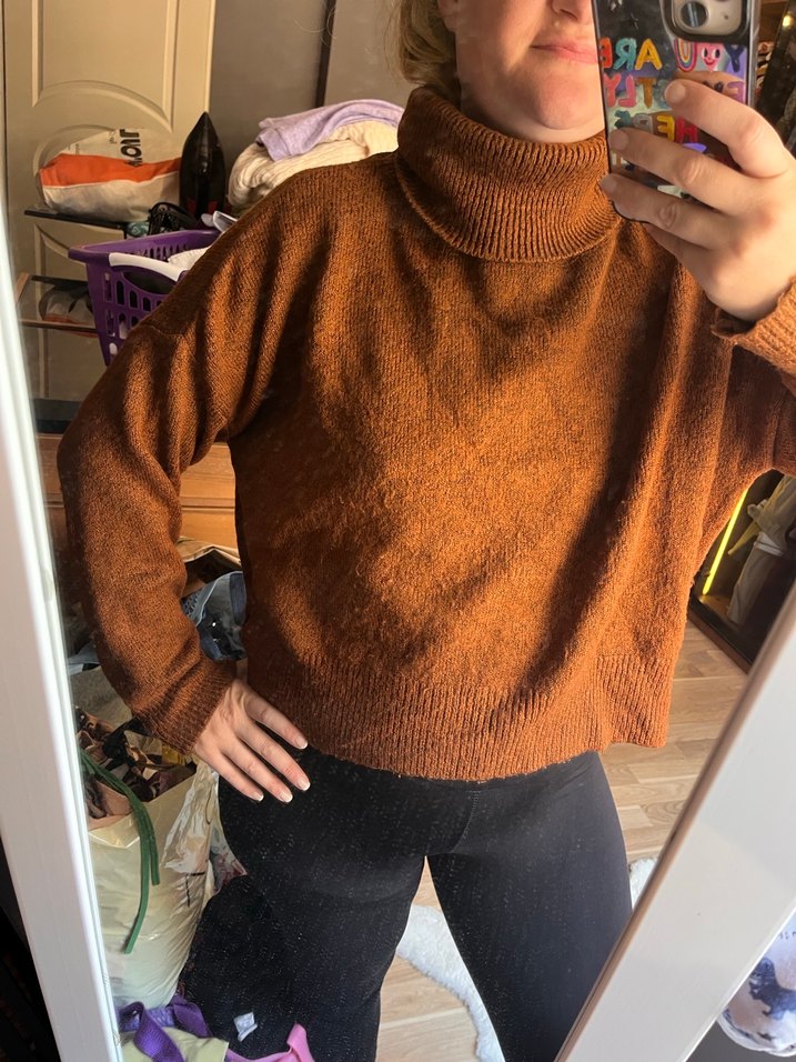 Kahverengi örgü kadın kazak, bol kesim ve boğazlıdır. Yumuşak yünden üretilmiş, uzun kollu ve midi boydadır. Rahat sokak stili için uygundur.