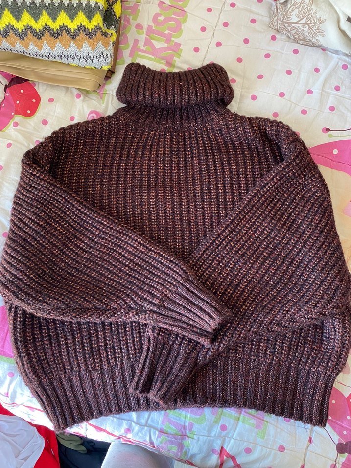 Kahverengi, boğazlı ve uzun kollu örgü kazak, rahat ve sade bir tarz sunar. Günlük kullanıma uygundur.