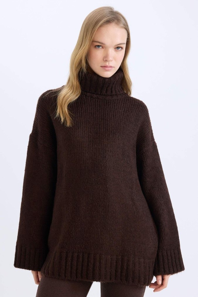 Kahverengi örgü yün kazak, boğazlı ve uzun kolludur. Rahat kesimi ve normal midi boyuyla günlük kullanıma uygundur. Bayılarak aldım bunu ama zayıfladım içine düşüyorum. 1 kere kullandım tertemiz duruyor L beden oversize o yüzden Xl giyen birine de çok rahatlıkla olur