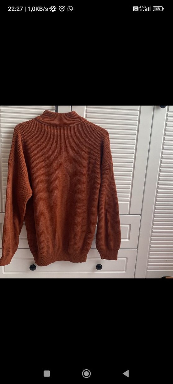 Kahverengi örme kazak, boğazlı ve uzun kolludur. Rahat, midi boyda ve desensiz tasarımıyla günlük rahat sokak stiline uygundur.