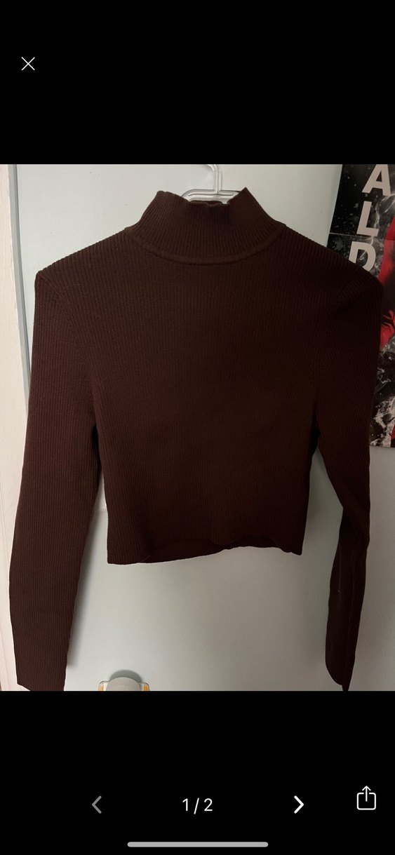 Bu kahverengi boğazlı triko kazak, fitted kesimi ve uzun kollarıyla günlük kullanıma uygun rahat bir stil sunar.