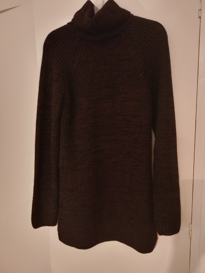 Bordı siyahboğazlı, uzun kollu kadın kazak.Yanlardan açık rahat kesimi ve midi boyuyla günlük kullanıma uygundur.