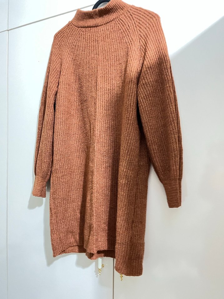 Kahverengi boğazlı, uzun kollu, bol kesim kadın triko Midi boyu ve yumuşak triko dokusuyla rahat ve günlük kullanıma uygun.