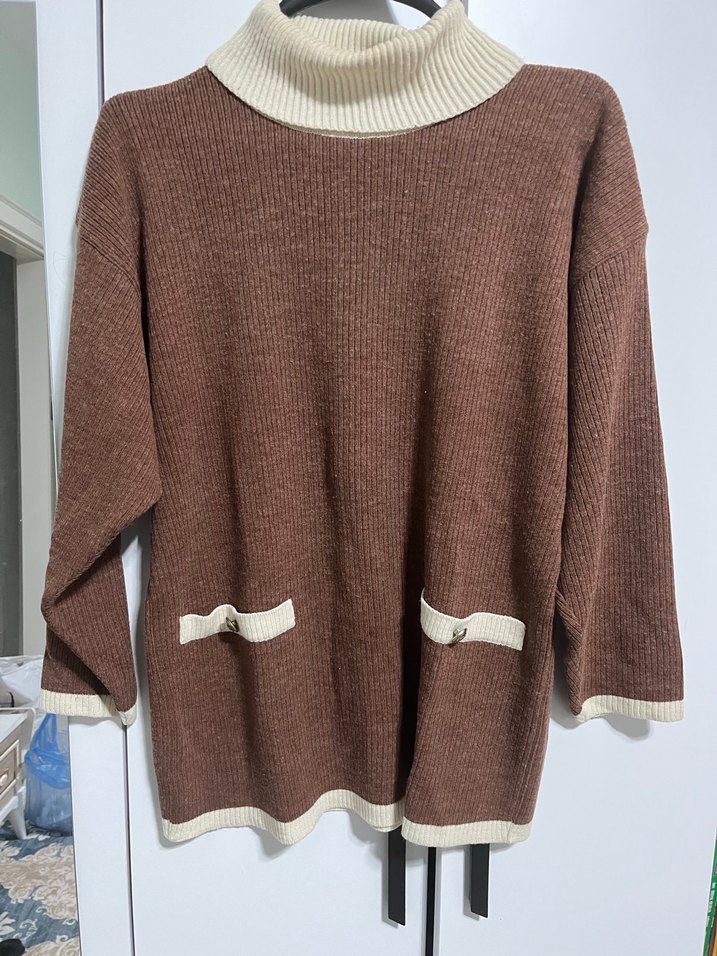 Kahverengi boğazlı uzun kollu triko kadın kazak, krem detaylı yakası, manşetleri ve etek ucu ile iki küçük cepli, günlük kullanıma uygun rahat bir parça.