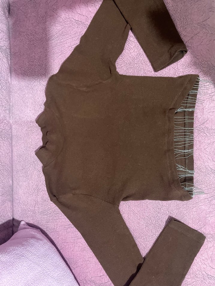 Kahverengi, boğazlı, uzun kollu, vücuda oturan, sentetik kumaştan örülmüş kadın kazak. Normal boyda ve etek kısmında püskül detayları bulunur, rahat sokak stili için uygundur.