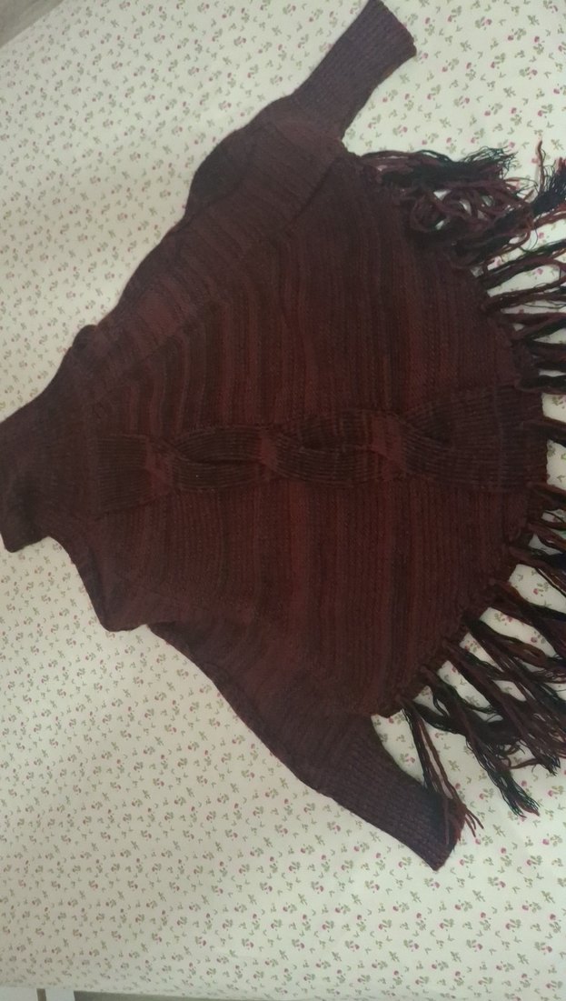 Bu kahverengi boğazlı kadın triko kazak, bohem tarzıyla uzun kollu ve fit kesimlidir. Püsküllü detaylarıyla rahat ve retro bir görünüm sunar.