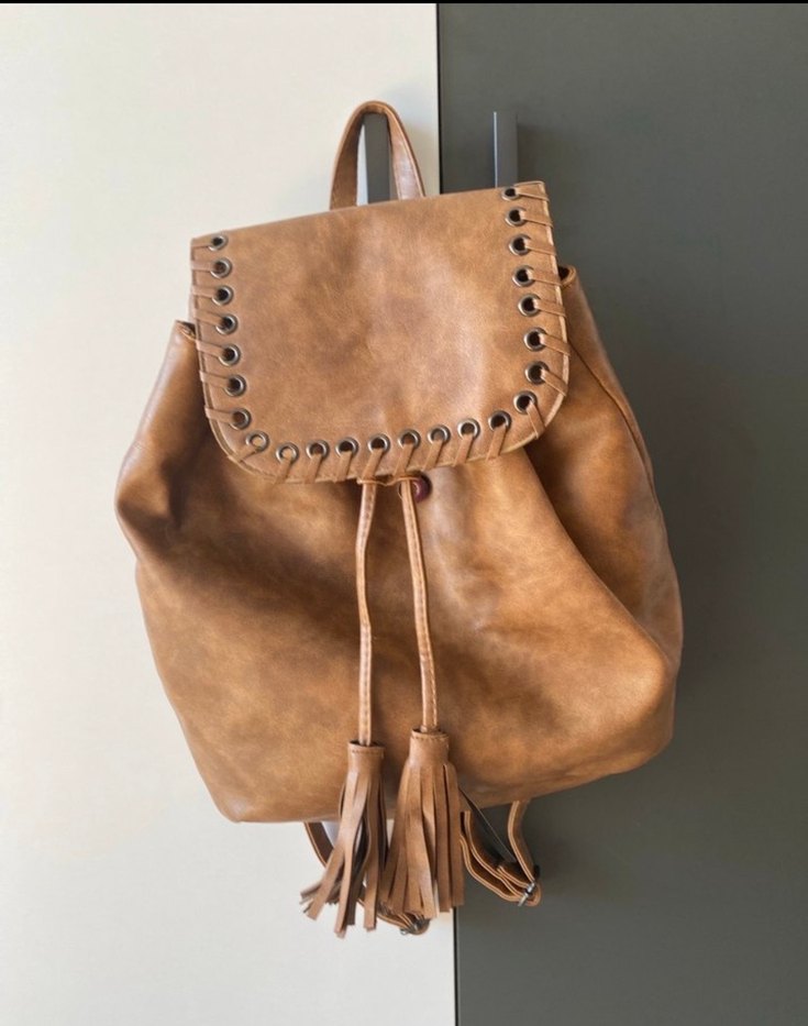 Kahverengi deri sırt çantası, püsküllü tokalı kapak ile parlak bohem tarzını yansıtır, günlük kullanım için uygundur.