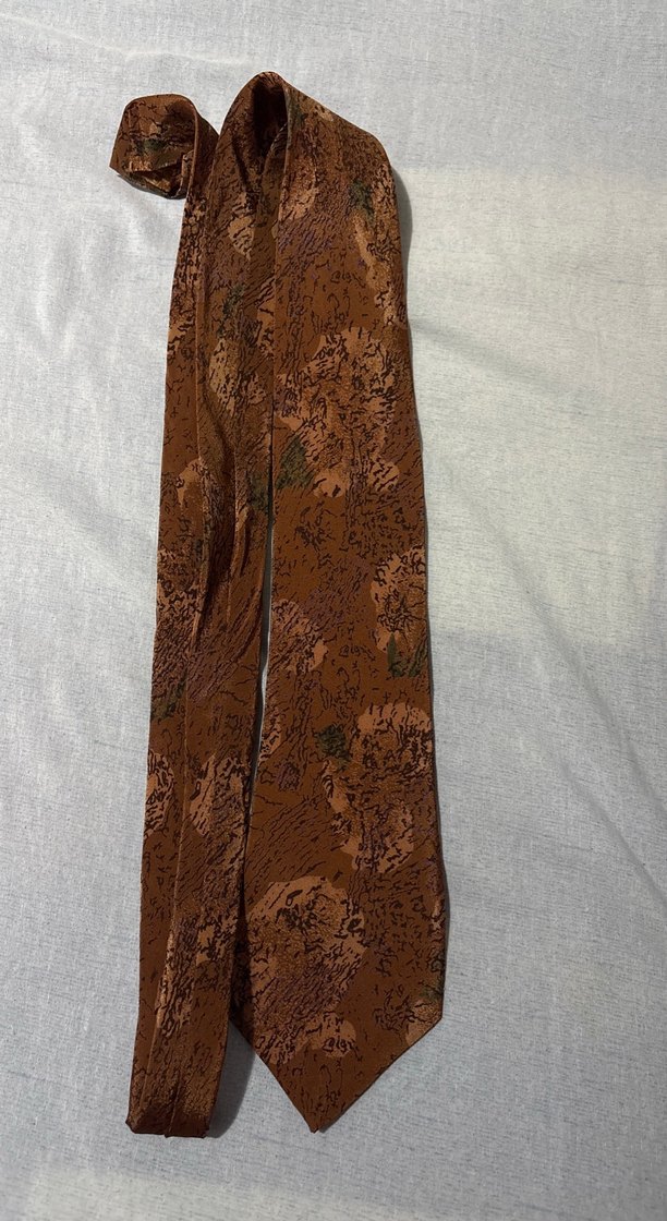 Bu erkek kravatı koyu kahverengi renkte olup, bohem tarzda desenlere sahiptir. Retro ve hippie stiller için uygundur.