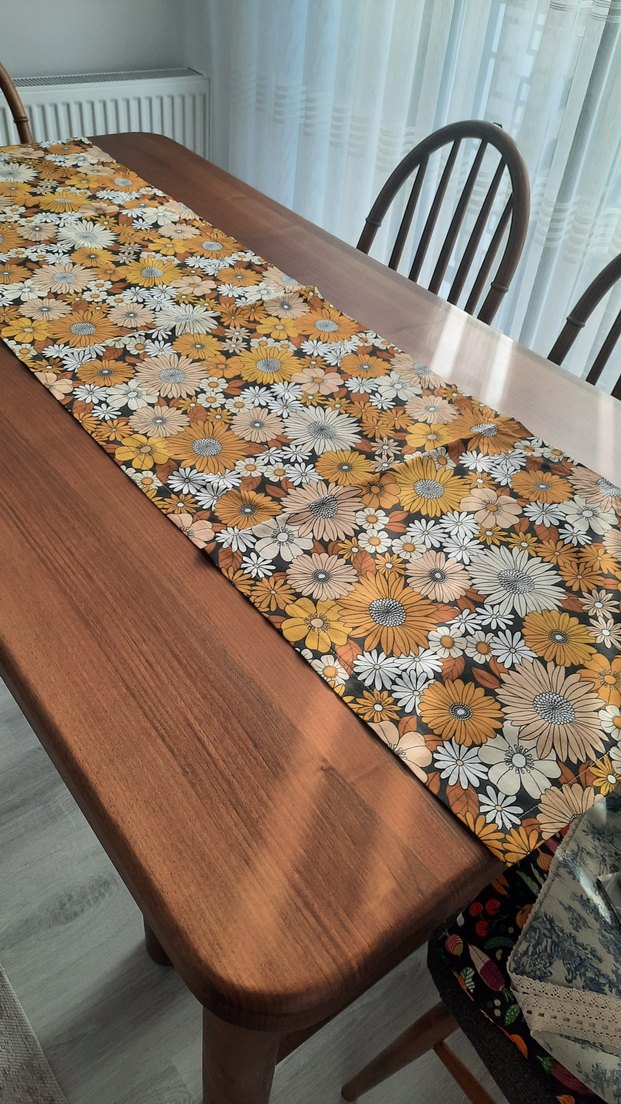Koyu kahverengi bohem tarzda, çiçek desenli masa örtüsü, masanıza sıcak ve sanatsal bir hava katıyor.