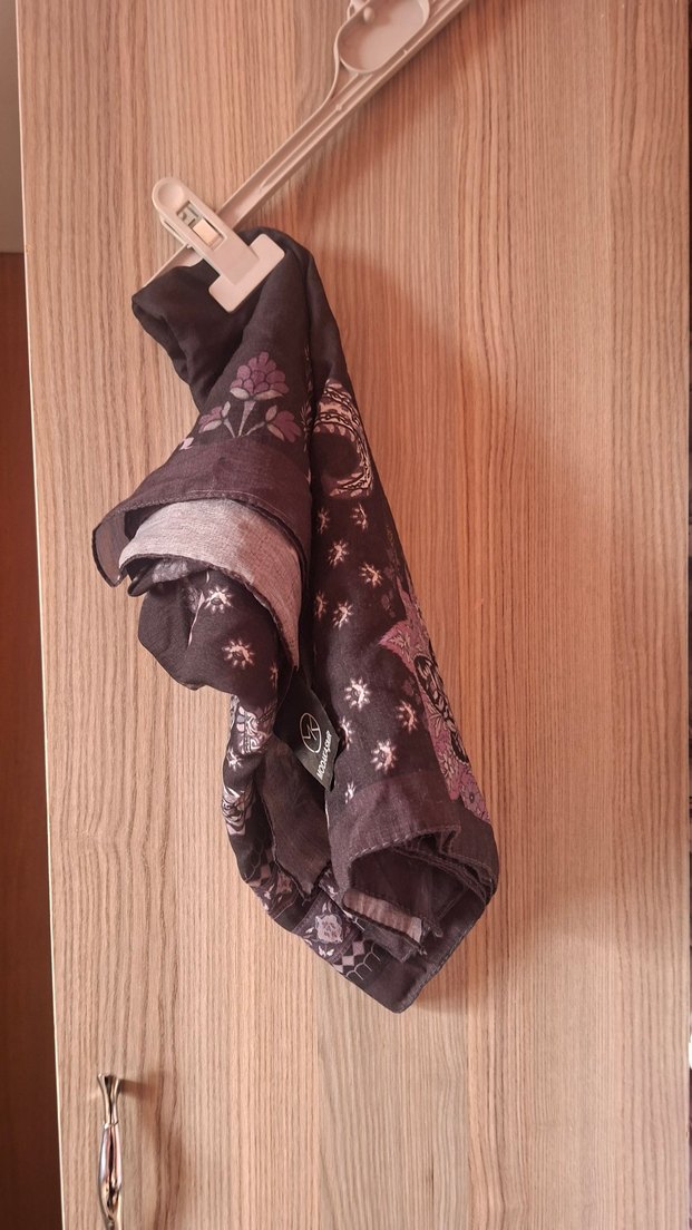 Kahverengi tekstil kumaştan, bohem tarzı desenlerle drapeli kadın fular.