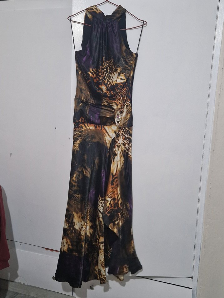 Kahverengi tonlarında, yüksek yakalı, kolsuz, drapeli ve vücuda oturan uzun elbise. Bohem tarzı ve sentetik kumaşla parti için uygun. sıfır