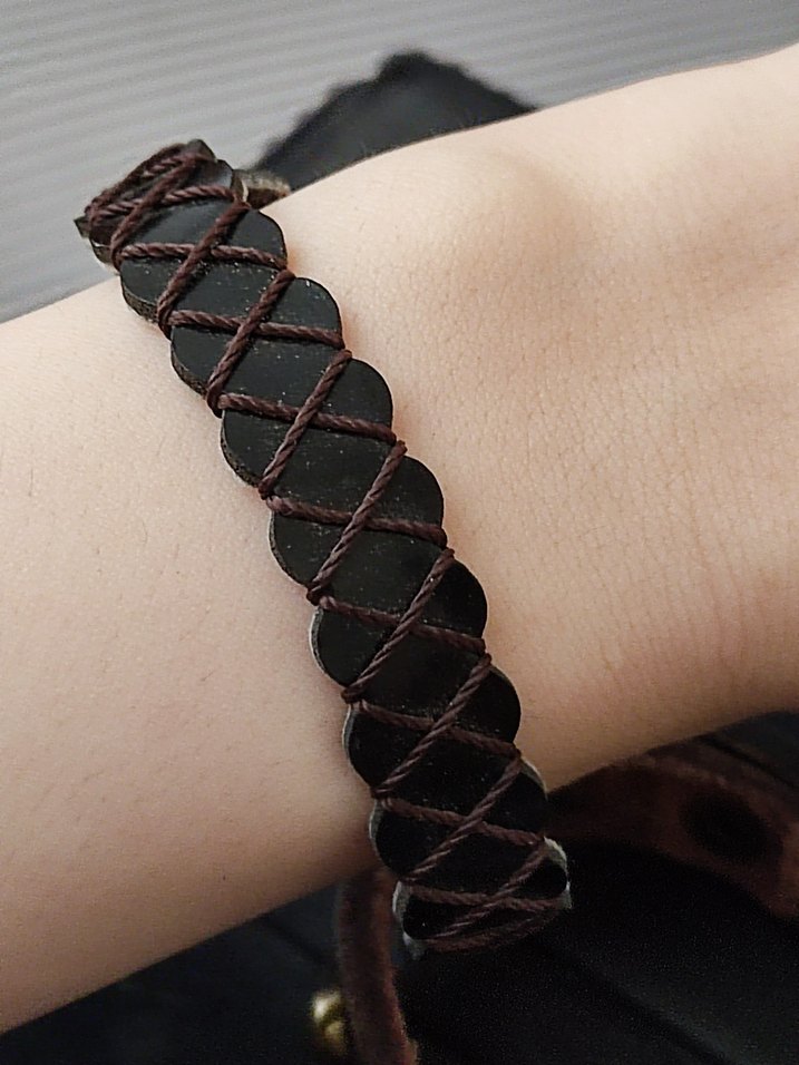 Koyu kahverengi parçaların iplerle örüldüğü, minimalist bohem tarzda erkek bilekliği. Retro ve hippie görünüm sunar. ✨ hiç kullanılmadı