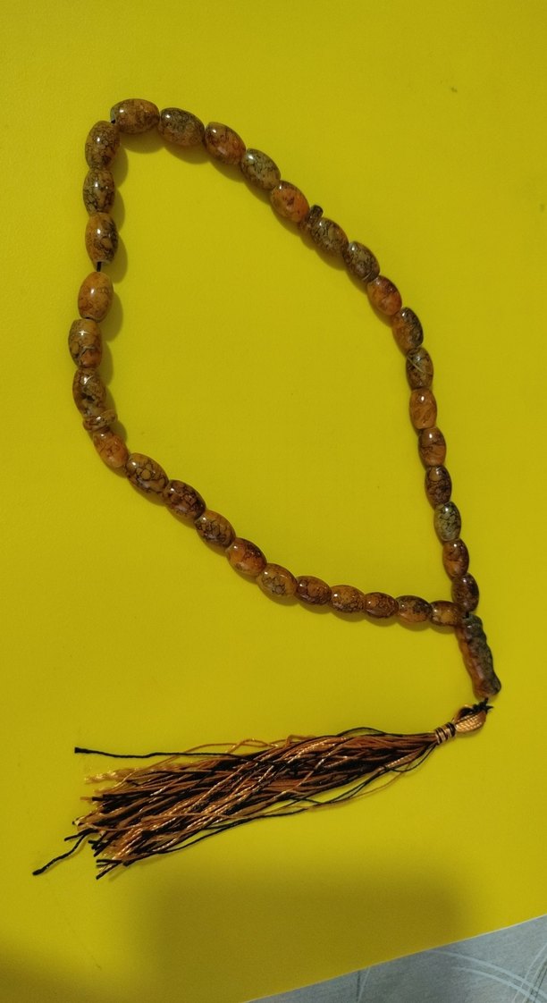 Parlak oval boncuklardan ve dekoratif püskülden oluşan koyu kahverengi bohem tarz erkek tesbihi.