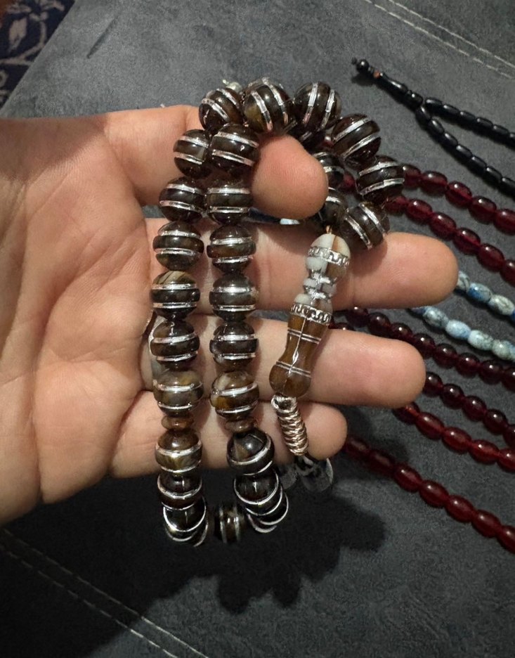 Koyu kahverengi ve beyaz çizgili boncuklardan oluşan, bohem tarzda erkek tesbihi. Parlak görünümlü boncuklar ve özel püskül detayına sahiptir.