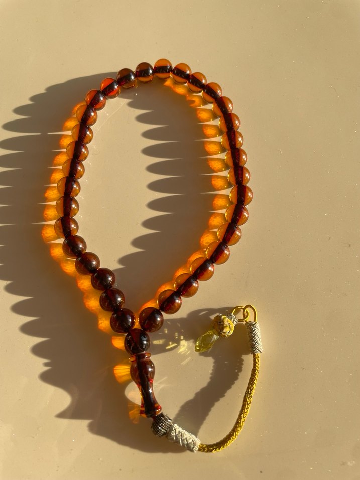 Koyu kahverengi bohem tarzda, minimalist tasarımlı erkek tesbihi, altın sarısı püskülle tamamlanmıştır. ✨