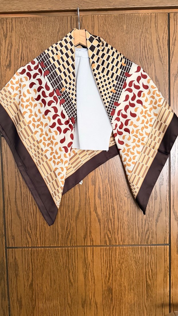 Koyu kahverengi ve desenli, sentetik kumaştan drapeli kadın fular, bohem tarz için uygun.