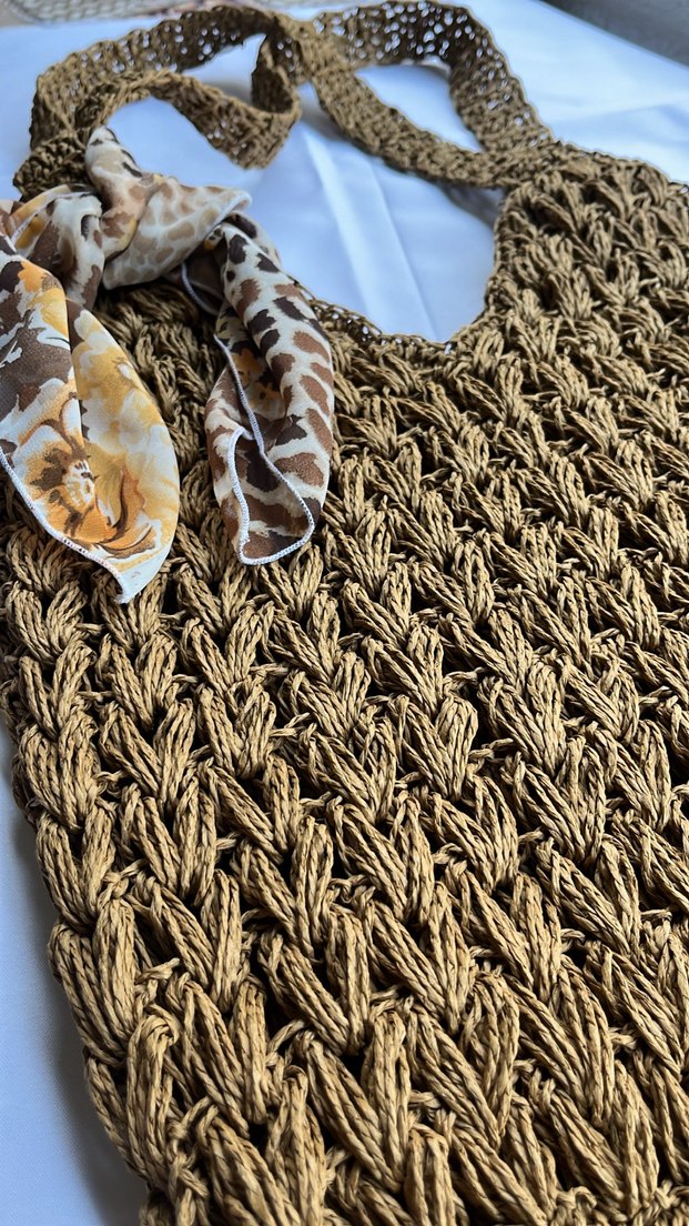 Hafif kahverengi, kürk detaylı ipeksi bohem tarzda kadın hasır çanta. Yumuşak dokusu ile retro ve hippie görünüm sağlar.