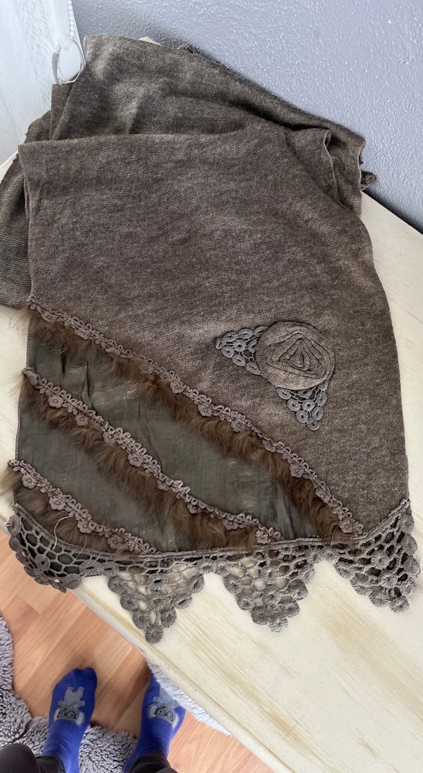 Kahverengi örgü kadın atkısı, kürk detayları ve dantel süslemeleriyle bohem tarzda tasarlanmıştır. Retro ve hippie görünüm için uygundur.