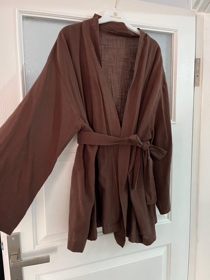 koyu kahve keten kimono standart beden 1-2 kere giyilmiş defosuz lekesiz standart