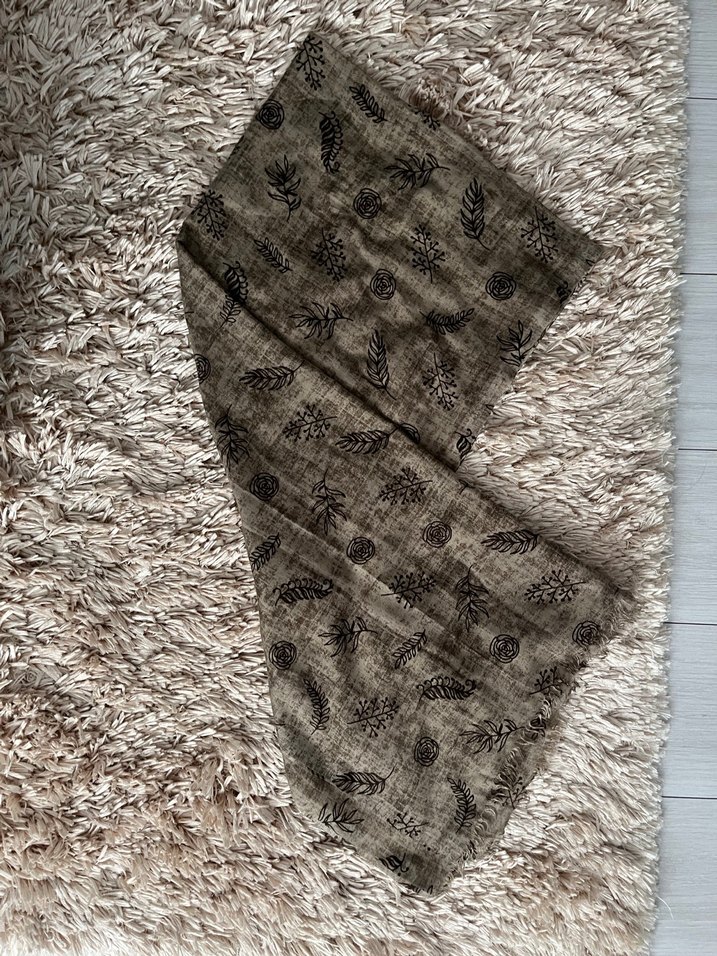 Kahverengi, kürklü detaylı, yumuşak sentetik kumaştan yapılmış, bohem tarzda, gri desenli kadın şalı.