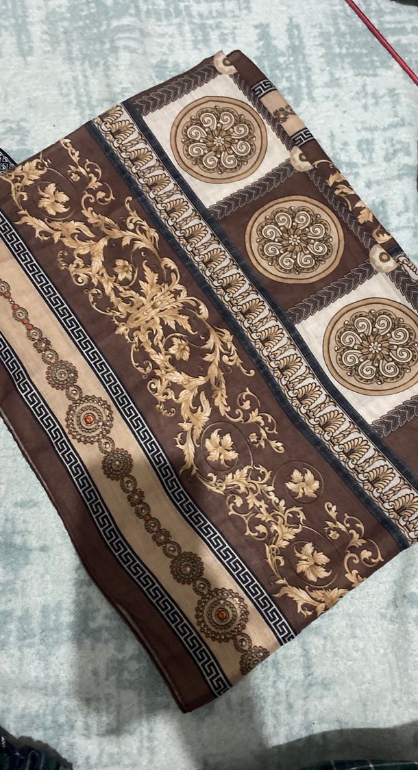 Sentetik kumaştan kahverengi bohem kadın şalı, drapeli ve detaylı vintage desenlere sahip. Retro tarz için uygun.
