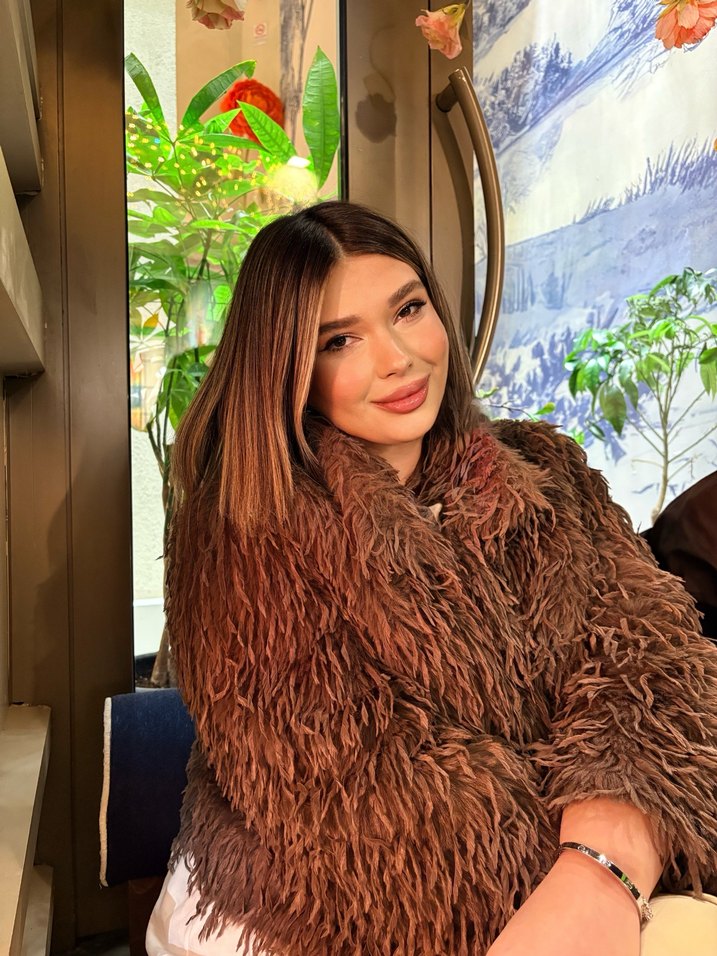 Kahverengi bohem tarzda, uzun kollu ve salaş kesimli suni kürk ceket. Yumuşak yün kumaştan, etnik desenli ve günlük kullanıma uygun rahat bir model.