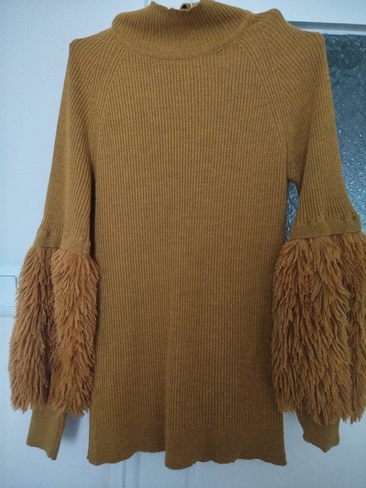 Kahverengi triko kazak, uzun kollarda kürk detaylıdır. standart kesim ve boğazlı yaka ile rahat, bohem tarz sunar.