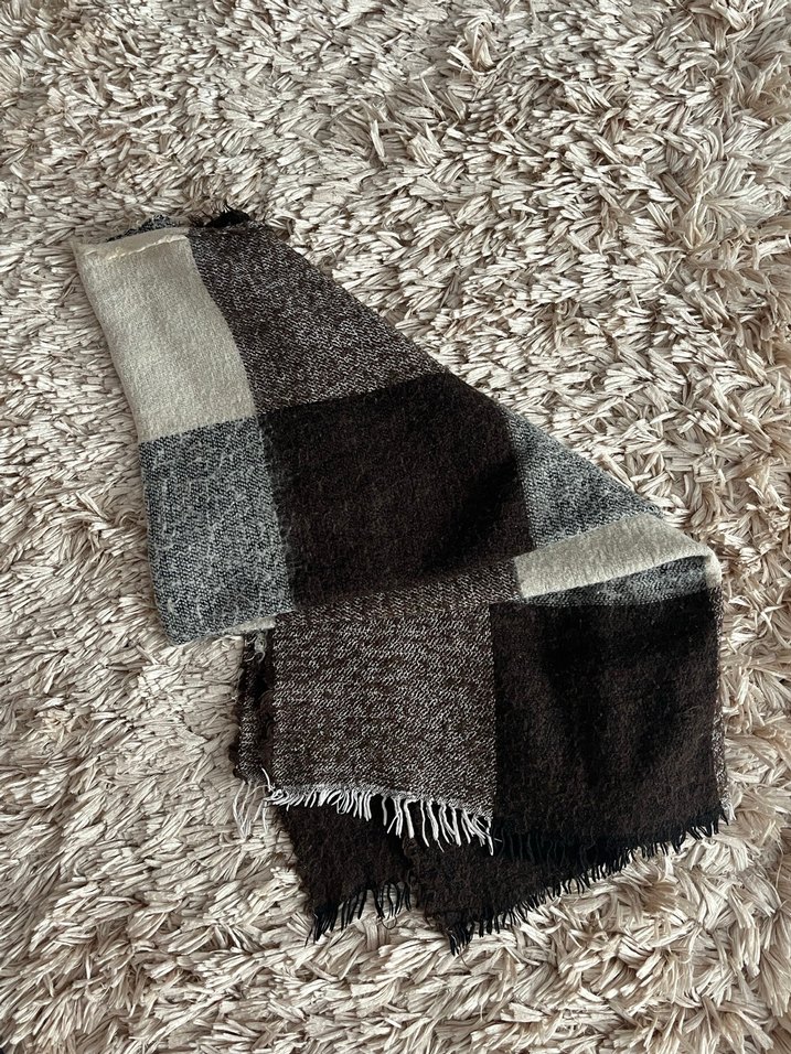 Kadınlar için kahverengi ve gri tonlarında, bohem tarzda, kürk detaylı yün kumaştan yapılmış rahat bir şal.