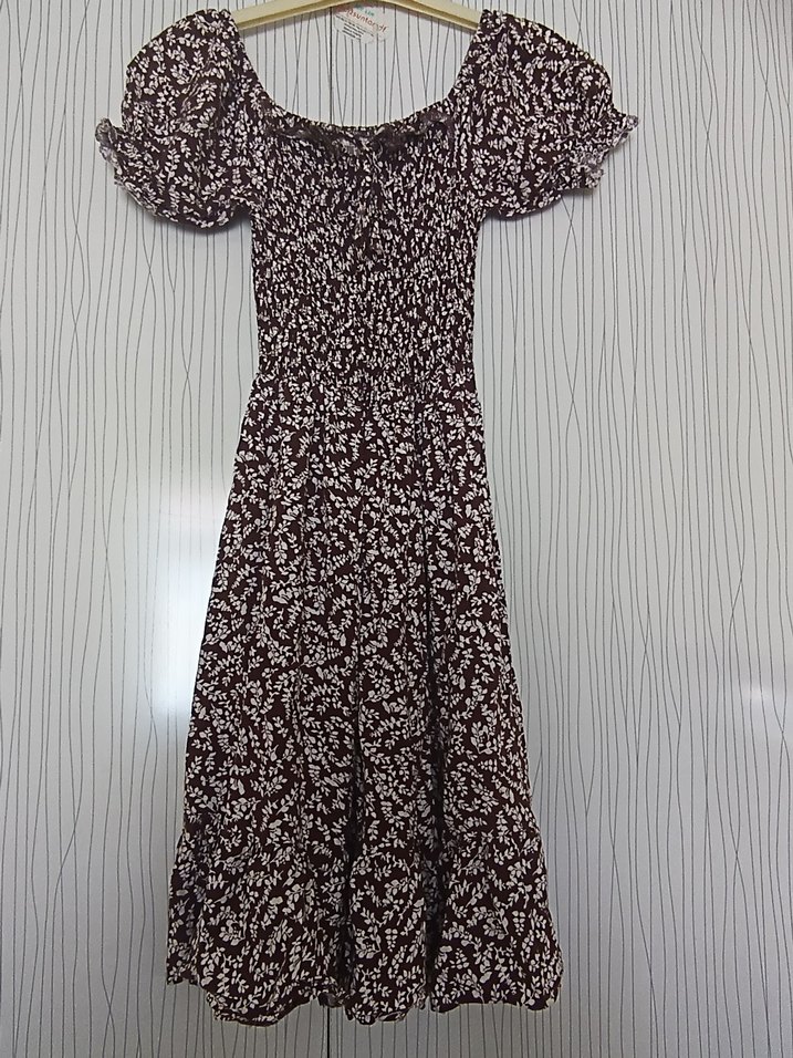 Kahverengi kısa bohem elbise, tekne yaka, kısa fırfırlı kollar ve bol kesimle tasarlanmıştır. Yumuşak sentetik kumaştan üretilmiştir.