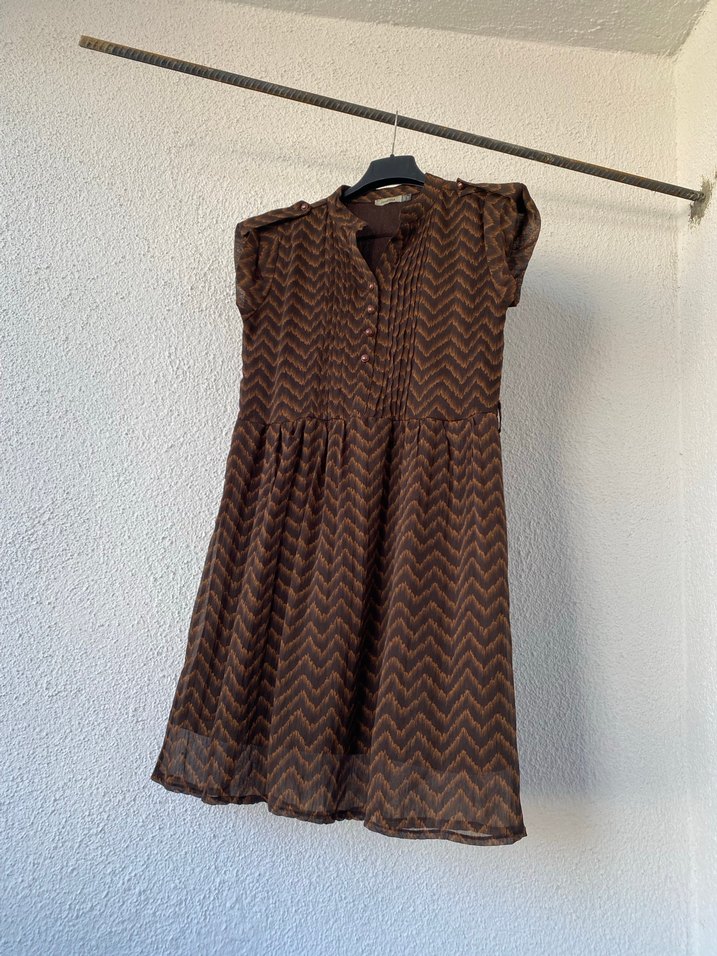 Kahverengi bohem midi elbise, bol kesim ve pile detaylara sahiptir. V yaka, kolsuz ve koyu tonlarda batik desenlidir. Günlük kullanıma uygundur.