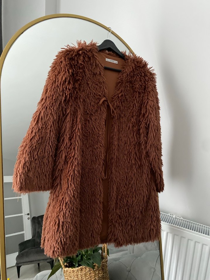 Kahverengi bohem tarzda, uzun kollu ve kesik yakalı, bol kesim midi uzunlukta yumuşak yün kumaştan, kürk detaylı rahat kaban.
