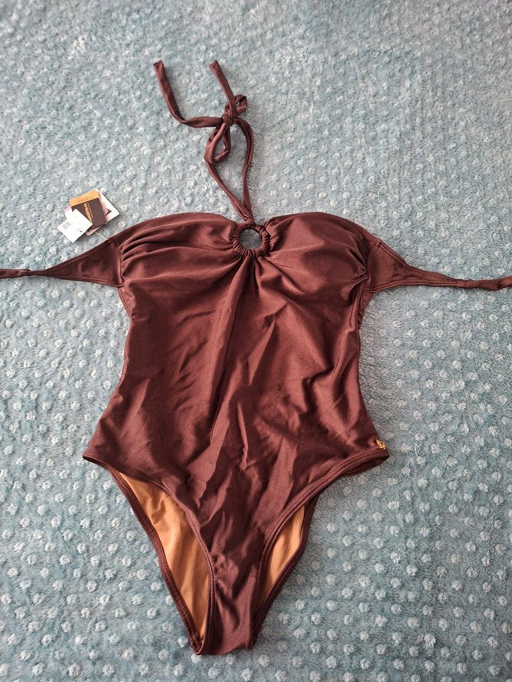 Kahverengi tonlarda, askılı detaylı, bohem tarzda, vücuda oturan midi mayo. sıfır ürün m beden