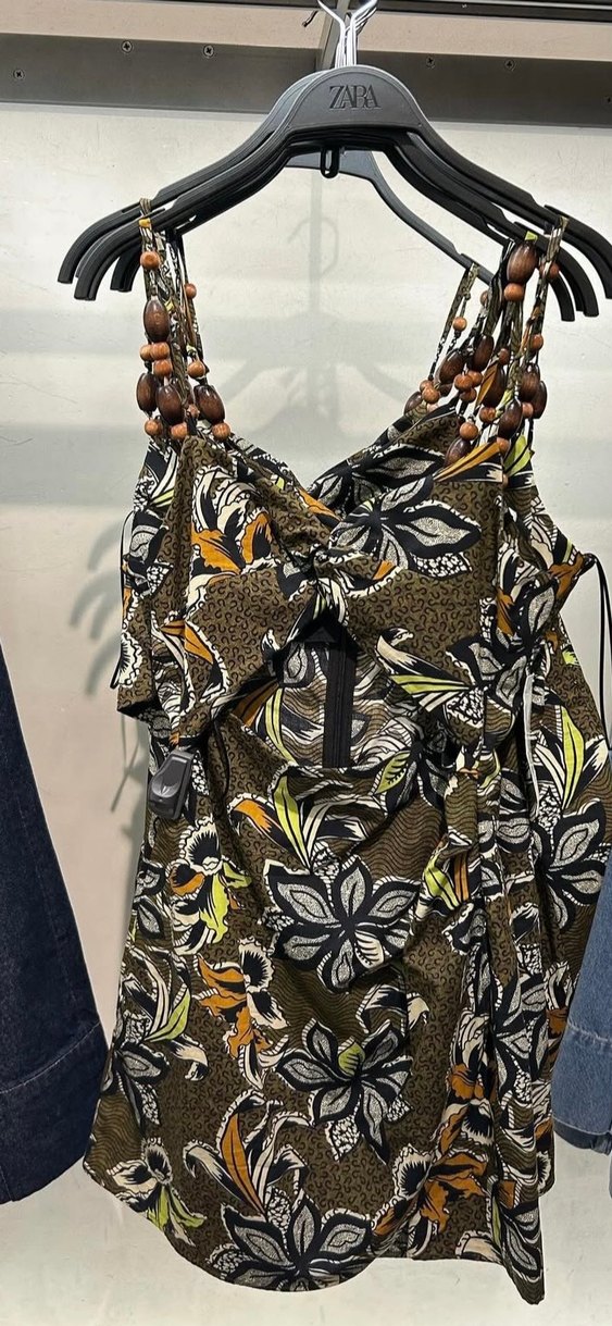 askılı kısa kahverengi elbise; desenli ve vücuda oturan bohem tarzda tasarlanmıştır S bedendir