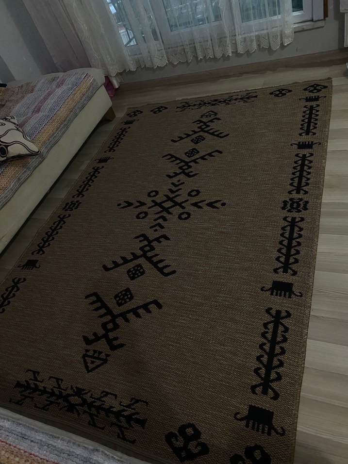 Koyu kahverengi bohem tarzda, nakışlı desenlere sahip halı, her mekâna sıcak ve sanatsal bir hava katar. Eni 170 uzunluk 240