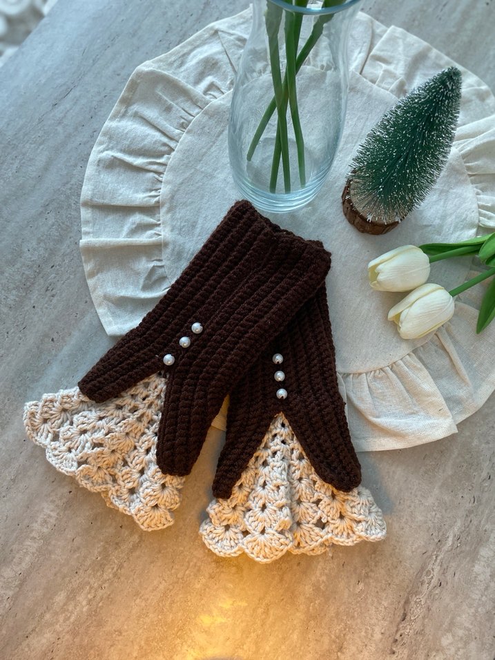 Krem dantel manşetli ve inci detaylı kahverengi örme kadın eldivenleri, rahat bohem tarzıyla öne çıkar.