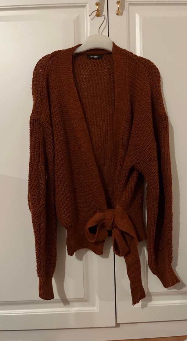Koyu kahverengi, uzun kollu, yüksek yakalı ve bol kesim örgü bohem tarzda kadın hırka. Belde bağlama detayı vardır, günlük kullanıma uygundur.