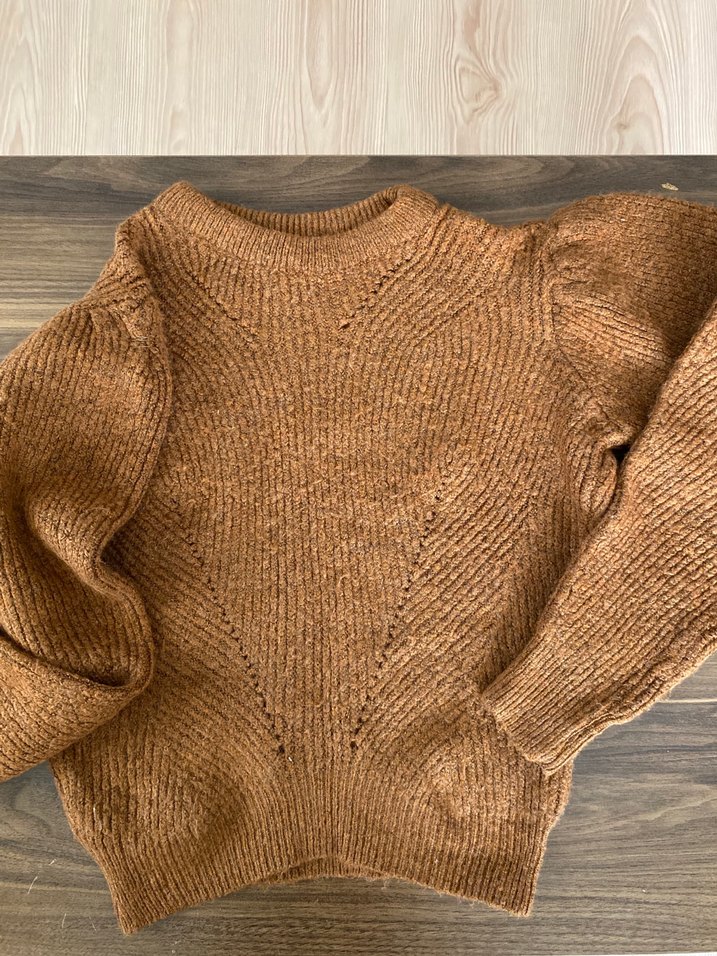 Kahverengi örgü kadın kazak, yuvarlak yaka ve uzun kolludur. Bol kesimi ve parlak dokusu ile rahat, bohem bir stil sunar. Rengi çok turuncu görünüyor ama koyu kahverengi