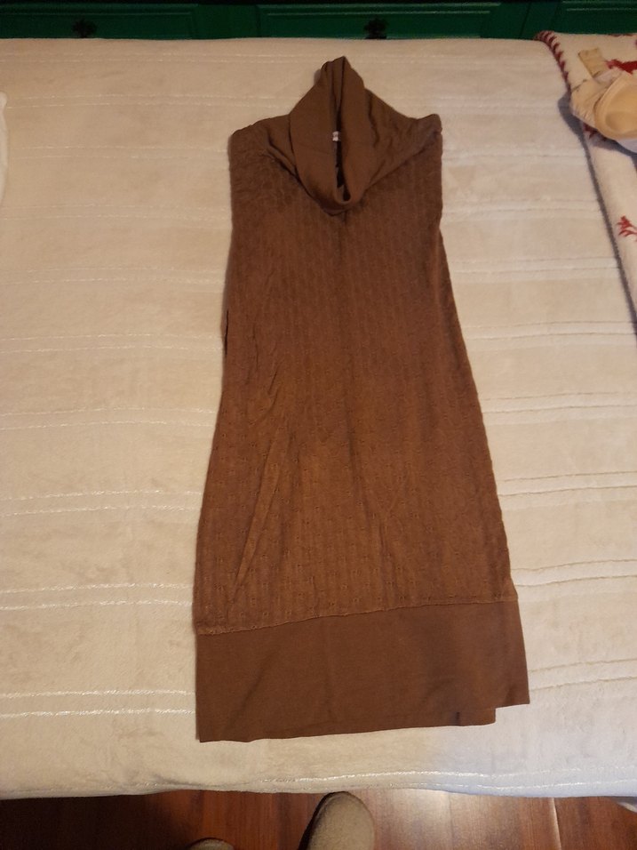 Kolsuz, uzun kahverengi örgü elbise, yüksek yaka ve bol kesimle rahat bohem tarz sunar.