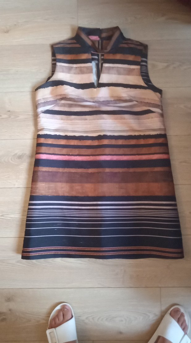Kahverengi tonlarda, pilili detaylı, tekne yakalı, kolsuz bohem uzun elbise, yumuşak sentetik kumaştan yapılmıştır. Adil Işık markadır.