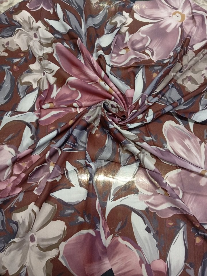 Koyu kahverengi, çiçek desenli bohem tarzı kadın eşarp, yumuşak sentetik kumaştan, şık bir görünüme sahip.