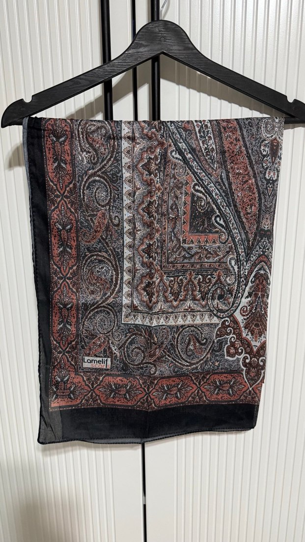 Kahverengi bohem tarzı kadın şal, yumuşak sentetik kumaştan drapeli tasarıma ve detaylı desenlere sahiptir.